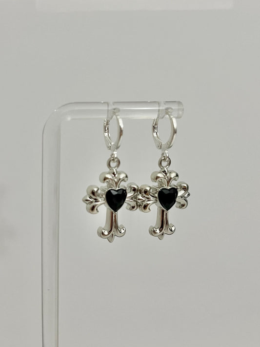 Handmade Silver Cross Earrings | Black Crystal Accent