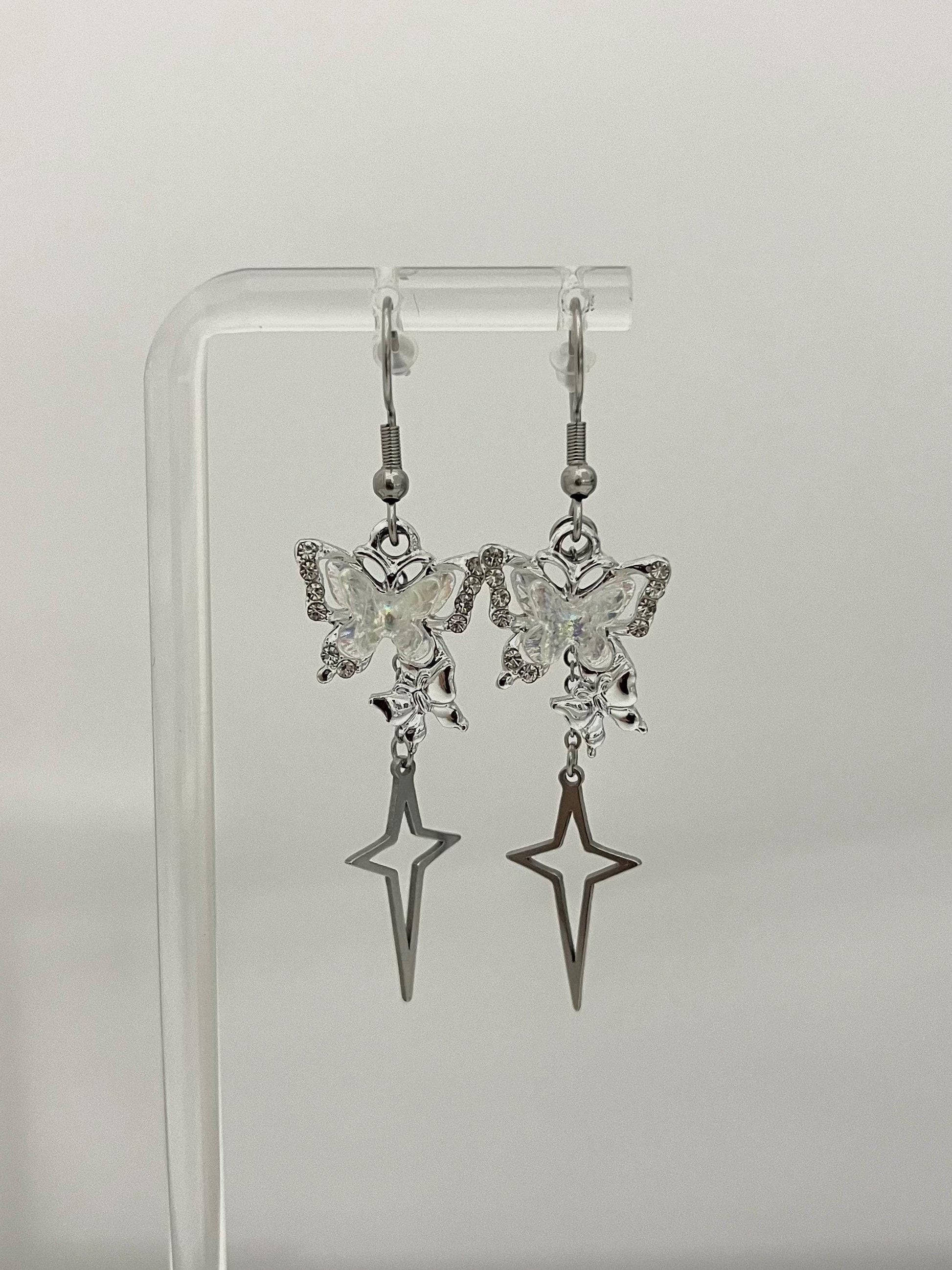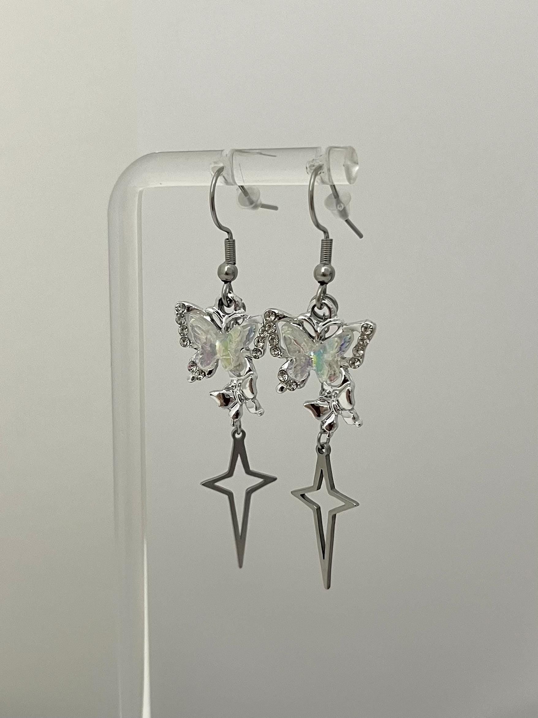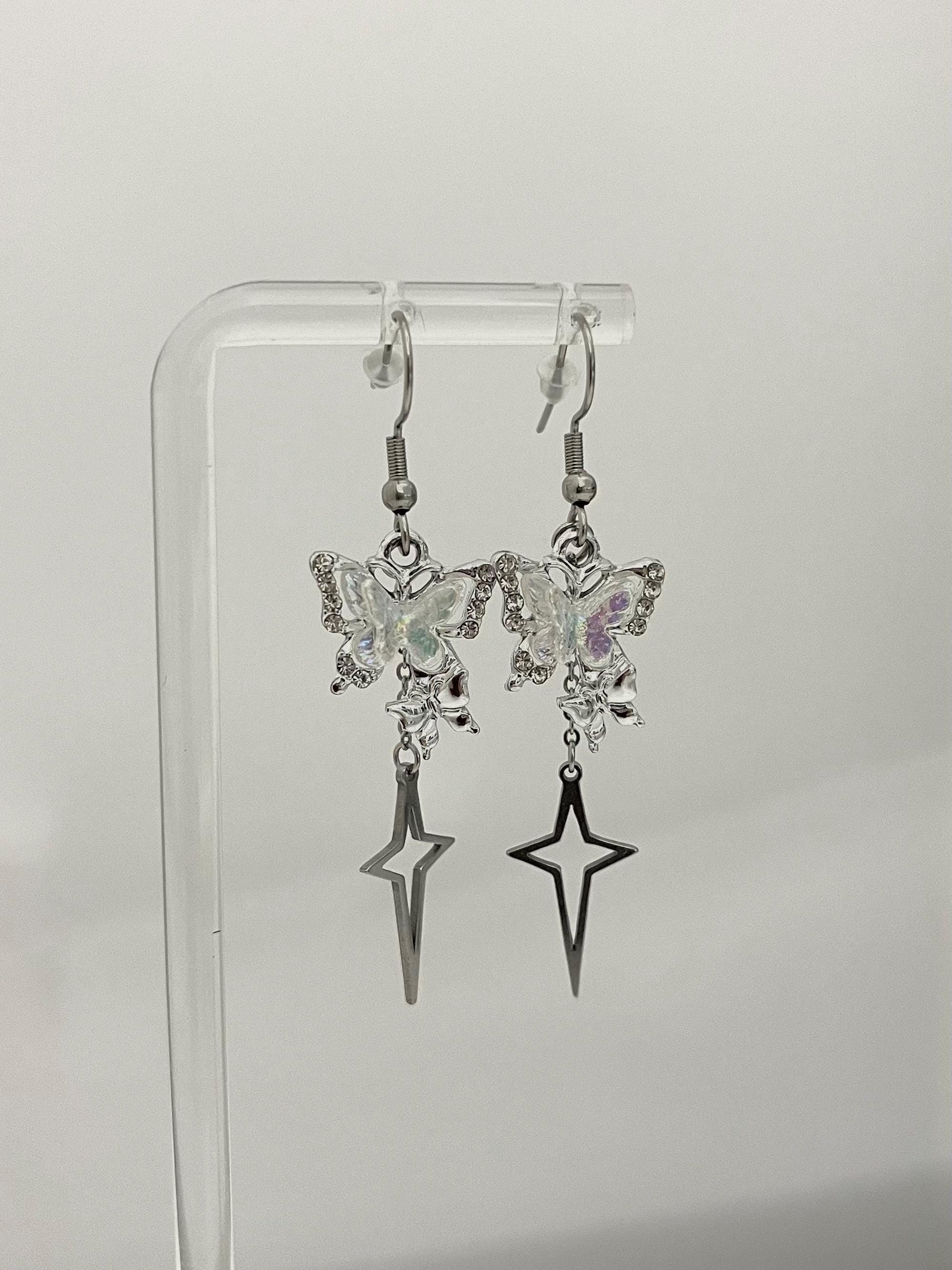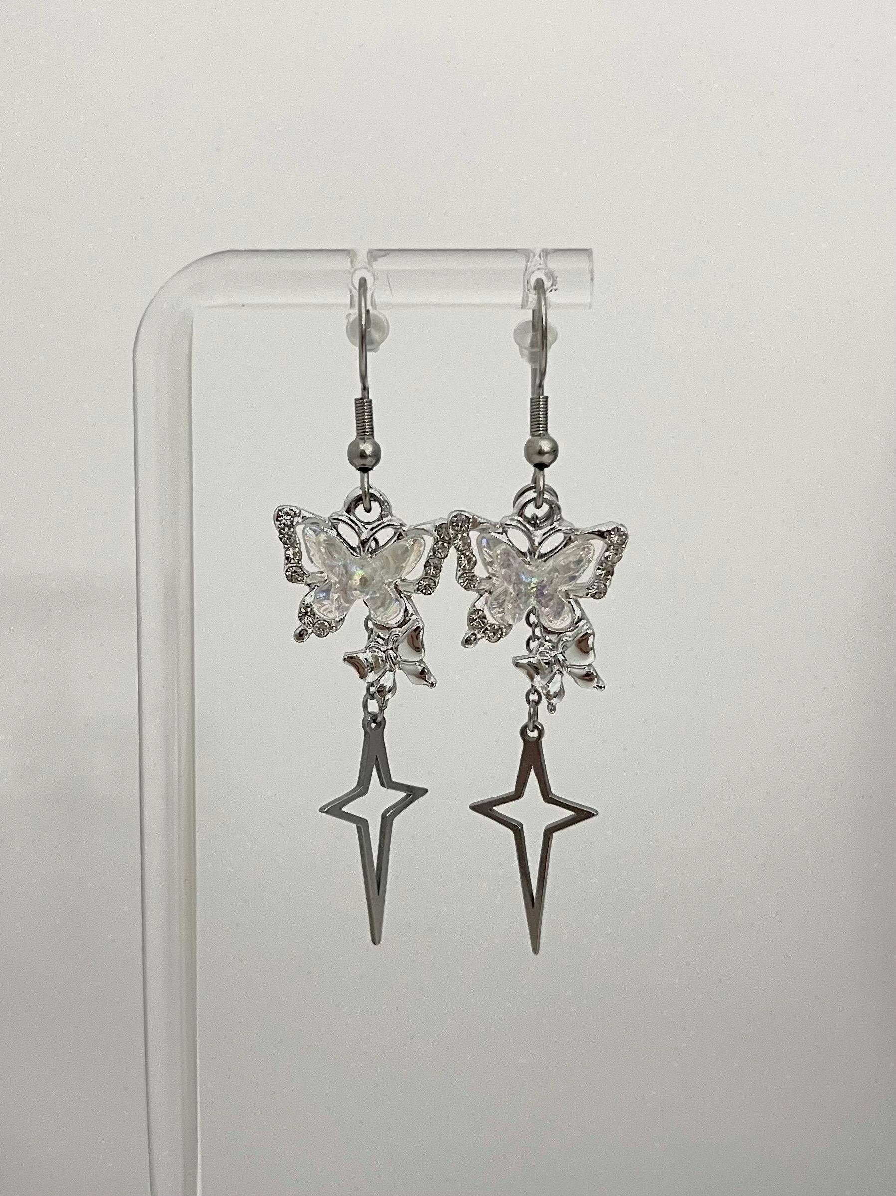 These beautiful butterfly earrings feature an iridescent sparkly butterfly charm and a stainless steel north star.