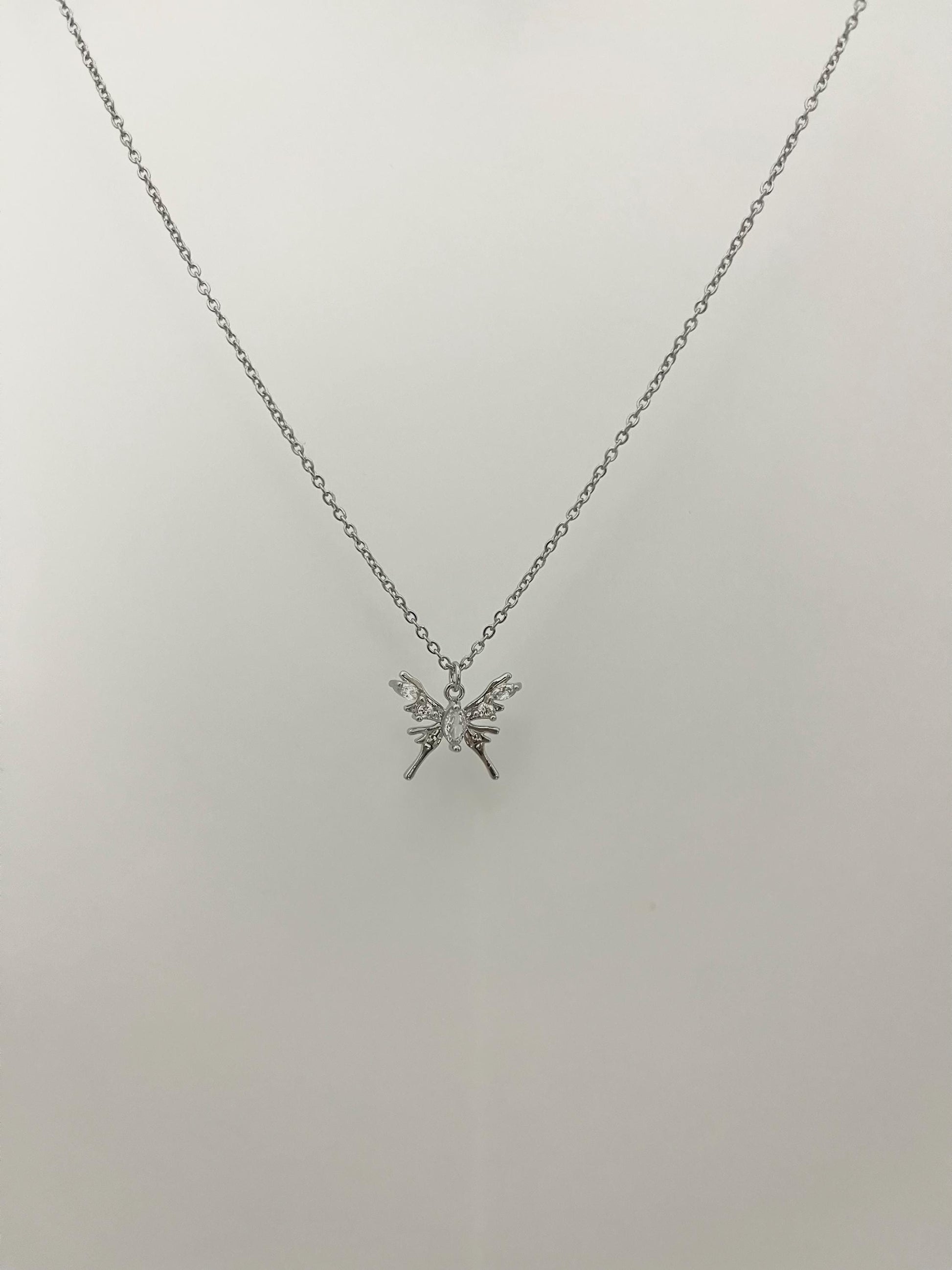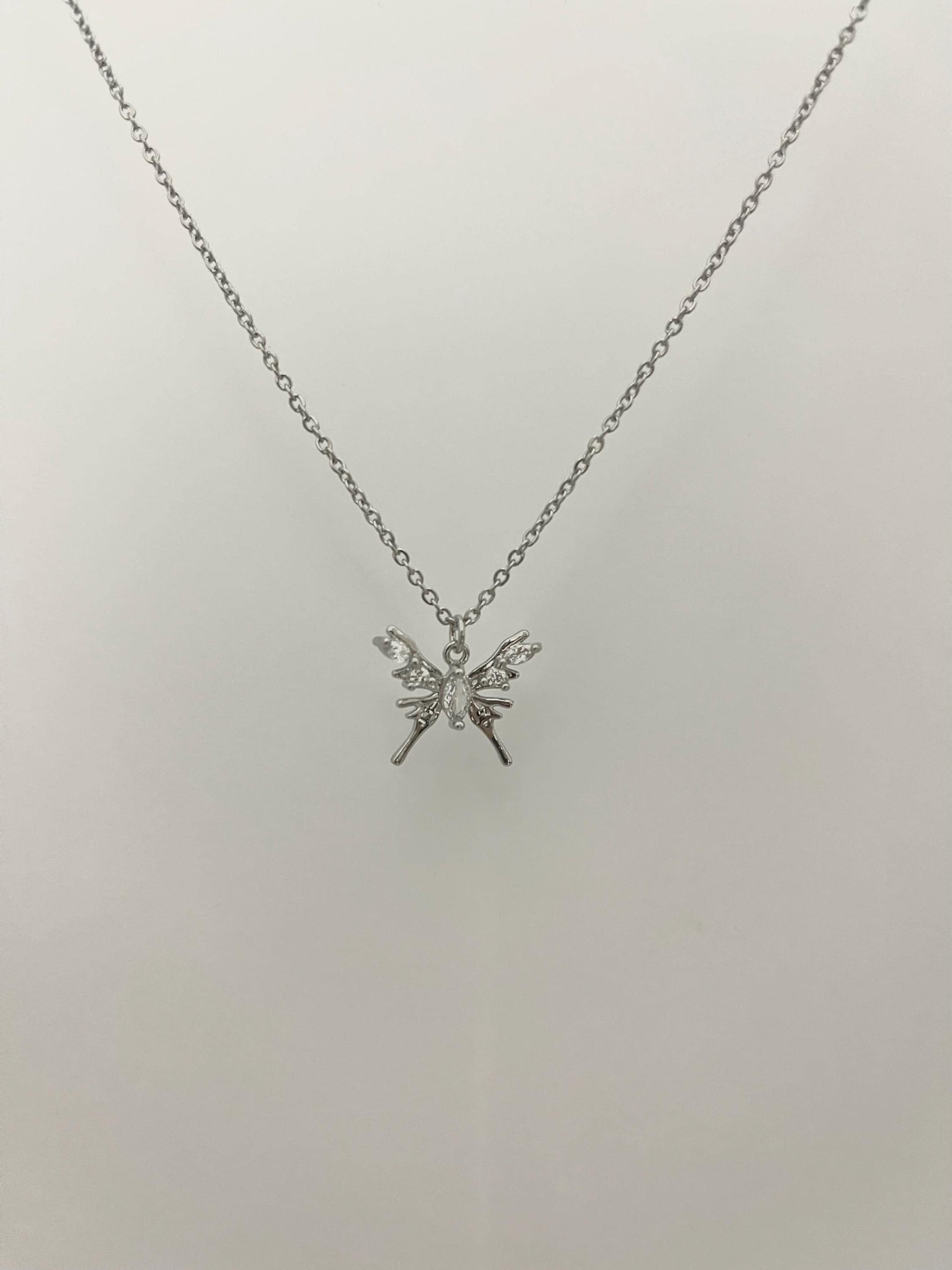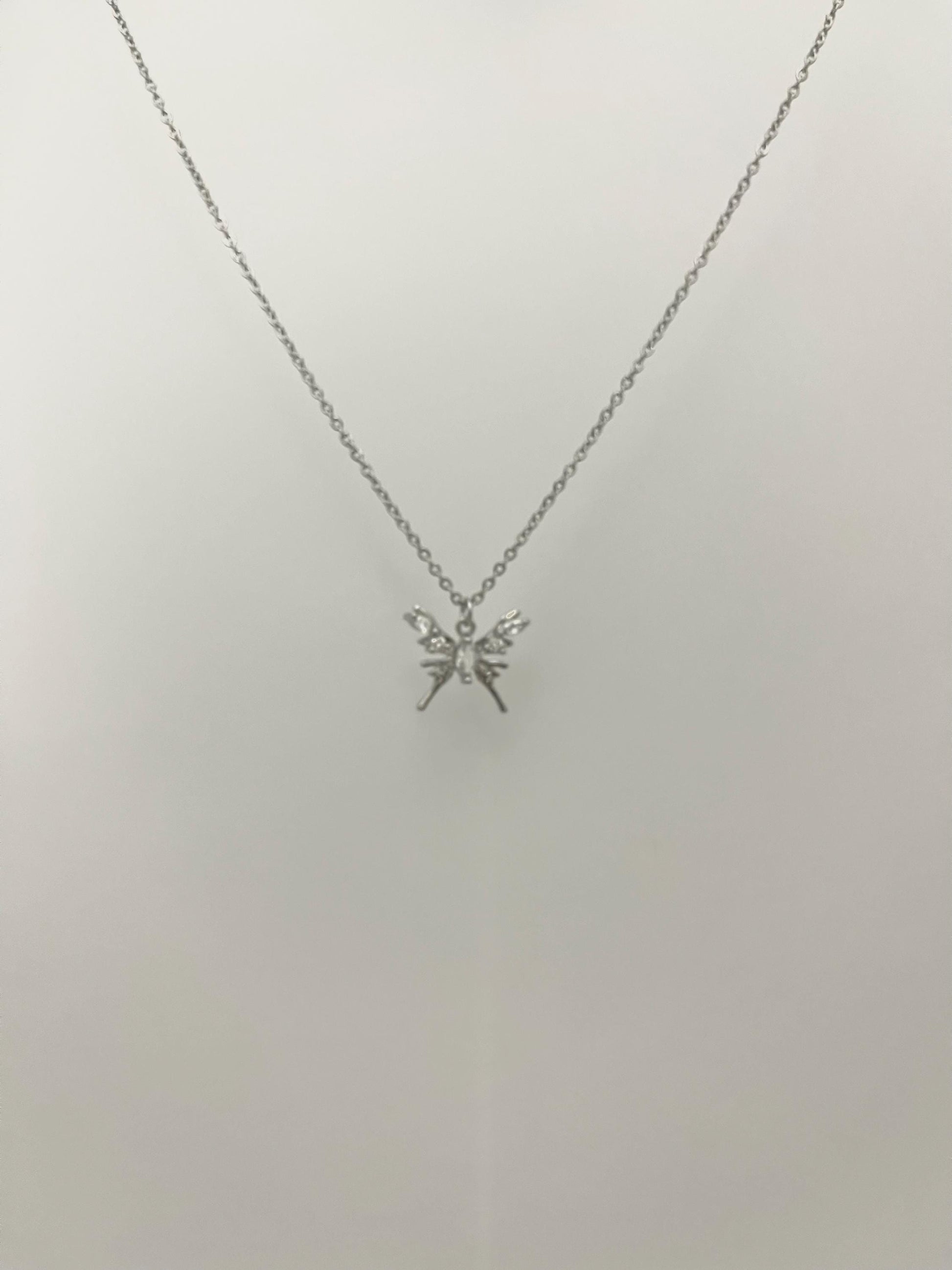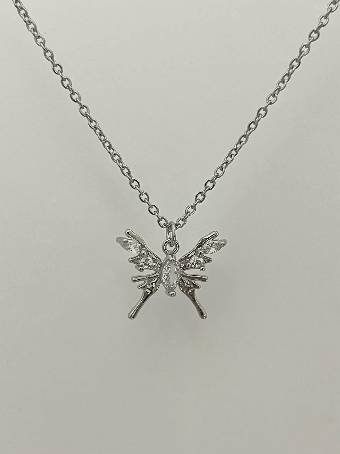 This Silver Moth Necklace is the perfect edgy touch to an outfit. The necklace is 17 inches long plus a 2 inch extender. The chain is made with stainless steel and the pendant is gold-filled over brass and contains cubic zirconia crystals. The pendant size is 18.2mm x 14.8mm.